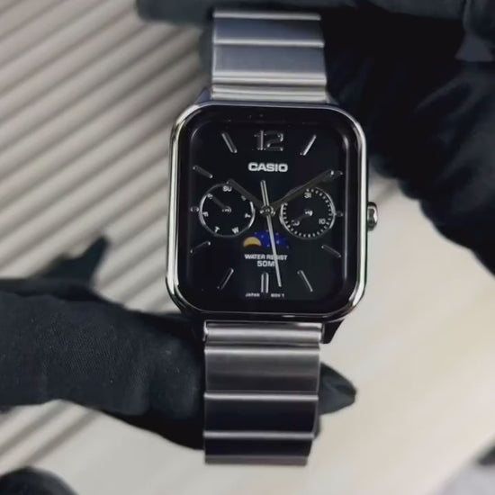 Com caixa retangular e mostrador multifuncional, este modelo une sofisticação moderna com um toque clássico de astronomia. Ideal para quem observa o tempo com estilo.
